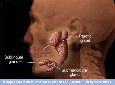 Parotid gland (par = near; otid = ear) Lies anterior to the ear Mumps - inflammation of the parotid glands caused by the myxovirus which spreads from person to person in saliva