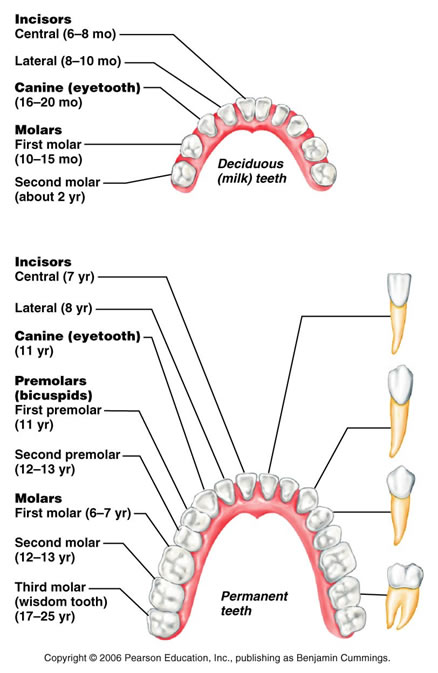 CLASSIFICATION OF TEETH Humans have two sets of teeth, namely: Deciduous (baby or milk) teeth Deciduous (baby or milk) teeth 20 teeth are fully formed by age two Permanent teeth Permanent teeth Replace deciduous teeth beginning between the ages of 6 to 12 A full set is 32 teeth, but some people do not have wisdom teeth Types of teeth