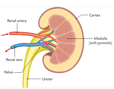 Internal Structure of the kidneys Cortex Cortex is the outer part of the kidney. It is the site where blood is filteed. Medulla The medulla is the middle part of the kidney. It is made up of tubes called collecting ducts that carry filtrate to pelvis Pelvis The pelvis is the inner region of the kidney after the medulla. it is connected to ureter Renal artery The renal artery is the bood vessel that enters the kidney.It transports oxygenated blood containing saits, nutrients. urea, water etc Renal vein The renal vein is the bood vessel that leaves the kidney. It transports deoxygenated blood filterate- urea and water etc Ureter Ureter is a muscular, tubular structure that tramsports urine frpm yhe kidneys to the bladder. |