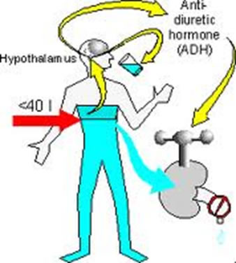 URINE REGULATION Hypothalamus (small area of brain) Secretes hormone called ADH (antidiuretic hormone) Fluid intake low = ADH secreted Stimulates reabsorption of water in nephron. Urine output decreases and is more concentrated Fluid intake high: ADH not secreted Less reabsorption of water in nephron Urine output increases and is relatively dilute |