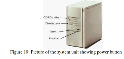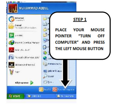 UNIT FOUR: LOGGING ONTO THE COMPUTER3.4. BOOTING- COLD BOOTING AND WARM BOOTING3.4.1. LOGGING ONLogging on means to switch the computer on. You can log on by pressing the power button on the monitor and the system unit. There are two types of booting namely, 3.4.1 a. Cool booting Booting is the transition period between the time the computer is switched on and when it starts normal operations. During this period, the computer system is being checked for consistency and correctness. Once this checking is over, the computer is now ready for operation. This type of booting is referred to as cool booting. 3.4.1. b. Warm booting While warm booting is the transition between restarting your computer system and when the system is ready for operation. 3.4.2. LOGGING OFF-SHUTTING DOWN Shutting down means to exit all programs and close the computer. This can be employed by the following processes: Step 1 Place the mouse pointer on the start menu button. A start menu as in the picture below will appear. Scroll to “Turn off computer” command at the base of the start menu, and then left click. A pop-up menu bearing options- “stand-by”, “turn off” and “restart” will appear on your desk top. |