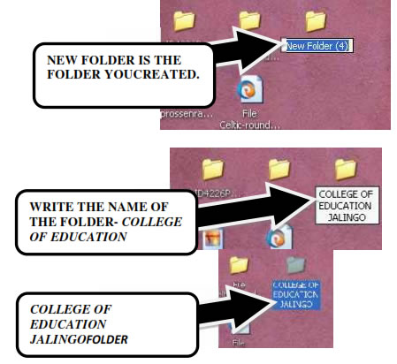 Step 3 Place your mouse pointer on the part written “Folder” on the fly-out menu and left click. Check on your desk top you will see a yellow icon. Beneath the icon you will see a space named “New folder”. Write the name of the folder in the space. Then left click. You can name that folder “Jalingo”.