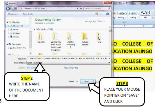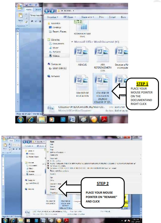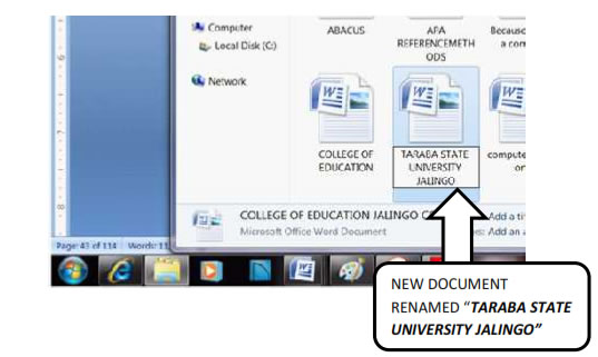 Step 2 Select the document you want to write the name of the document in the File name space on the dialogue box. Then place your mouse pointer on OK on the dialogue box and click. 4.3.2.4. Naming and Renaming Documents To rename a word document, employ the following strategies: Step 1 Open the folder where your document is stored Step 2 Highlight the document Place your mouse pointer on the document and right click Step 3 Scroll down to rename and write the new name of the document. For instance you can trace the document stored in Books folder and rename it to Taraba State University Jalingo. The new document name will look like the picture below