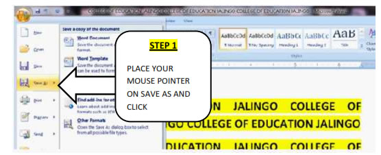 4.2.3.3. Saving a Document Step 1 Place your mouse pointer on the Microsoft Office Button and Click scroll down to Save or "Save As" as in the picture below.