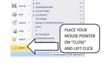Place your mouse pointer on the Office Button and click. A drop down menu as in the picture below will appear on your desktop.