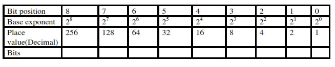 5.1.2.1. How to convert Binary to decimal number? To convert binary numbers to decimal do the followings: Step 1 Create a table with four rows. Step 2 Insert the bit position in the first row of the table. Each cell of the table should have one figure. Step 3 Insert the base exponent in the second row of the table. Each cell of the table should have one figure. Step 4 Insert the place values (decimal values) in the third row of the table. Each cell of the table should have one figure. Step 5 Insert the bits (binary number to be converted) in the first fourth row of the table. Each cell of the table should have one figure. Step 6 Then bring down the place values whose bits are “1” to each column of row 5. Step 7 You then add up the place values. This will be your result.