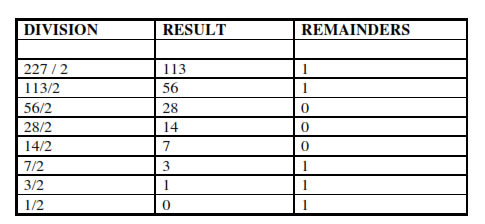 Step2 We repeatedly divide the decimal number by 2 (the base number of the binary system) collecting the remainders. If we divide an even number by 2 there is no remainder, if we divide an odd number by 2 there is a remainder of 1.If the figure is divided by two and there is remainder, then put 1 against the figure. Step3 Continue the division until there is no remainder Step4 Then arranged the remainders-1s and 0s from the lower part of your division to the top, that is from the MSB to LSB Example 1 Convert Decimal number 227 to binary. To convert 227 to binary, divide the number repeated by 2.