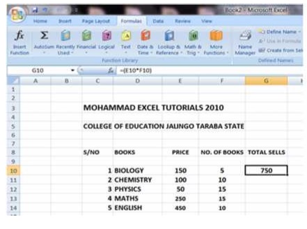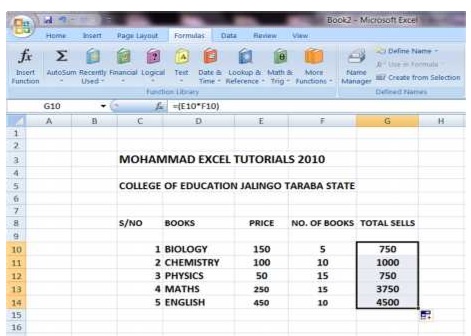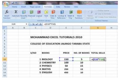 Type equal to sign (=) in the cell. Put open bracket sign (. Then type the cell no. e.g Cell E10, followed by star sign (*). Type the number of the cell to be multiplied with and closed the bracketĀ by putting closed bracket- ). This is illustrated below. In the illustration I multiplied cell E10 and F10.