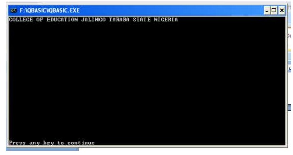 Let's see what happens if we did not put CLS before PRINT of "COLLEGE OF EDUCATION JALINGO TARABA STATE NIGERIA"