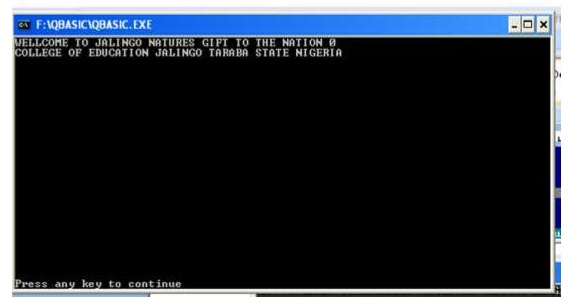 Press F5 or run. The window below will appear on your desk top. Note that the first output "WELLCOME TO JALINGO NATURES GIFT TO THE NATION" is removed from the screen.